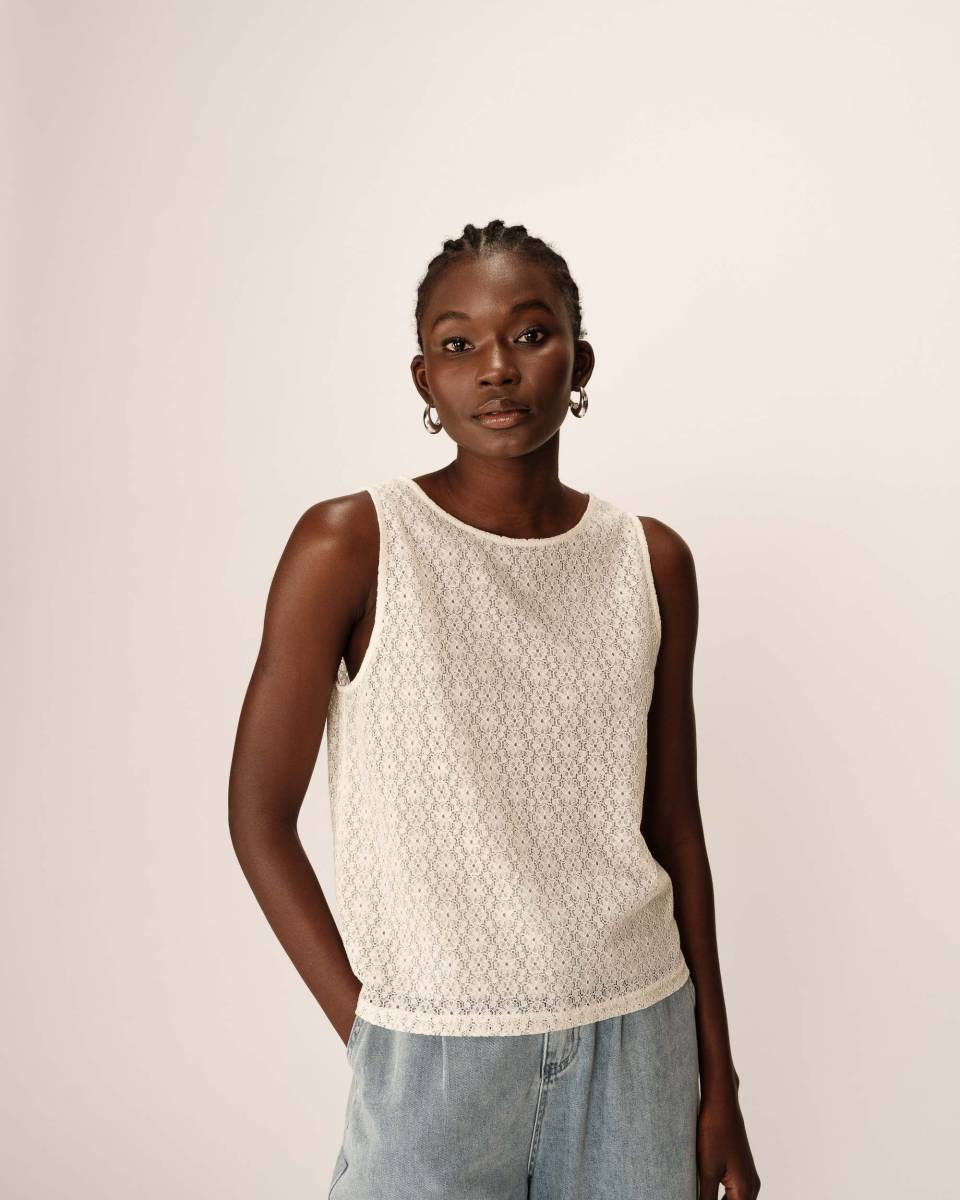Un top en dentelle blanc avec un jeans taille haute et des sandales.