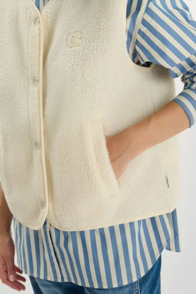 Veste sans manches sherpa, jeans droit et pull côtelé