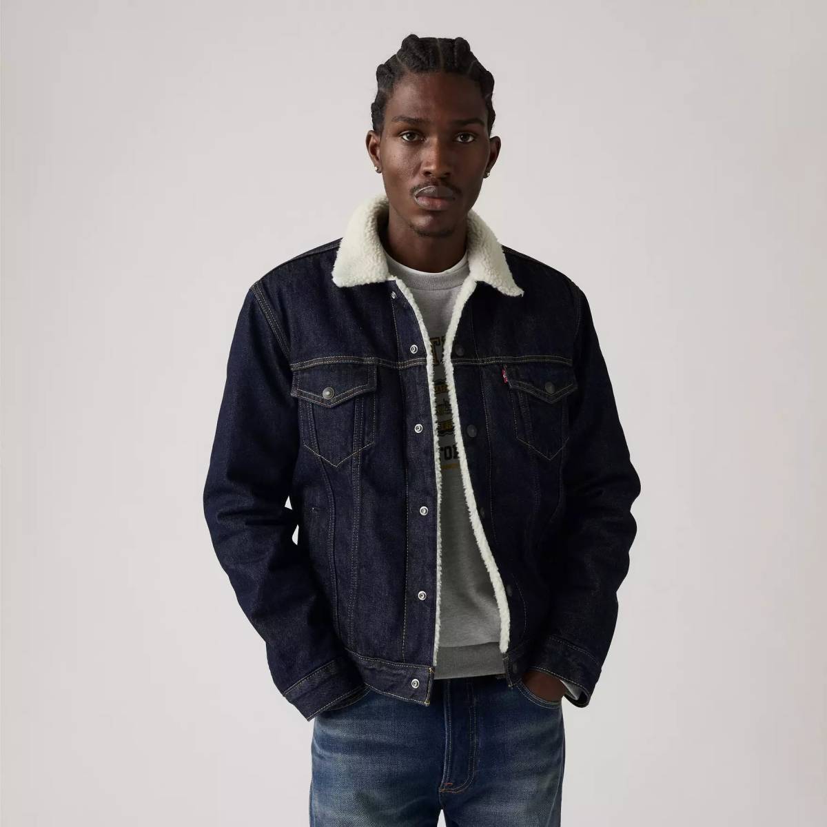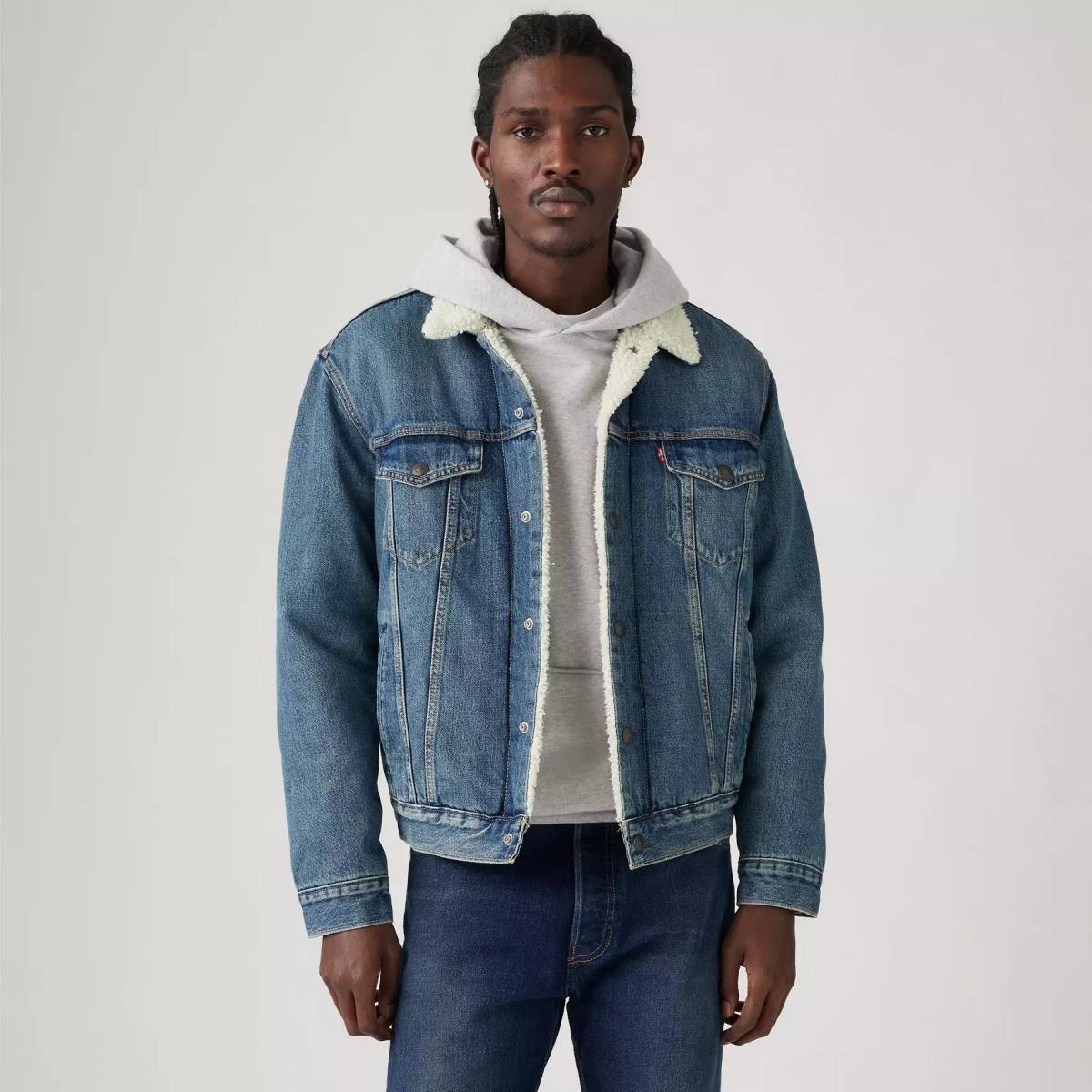 Détails : col en sherpa, poches poitrine à rabat boutonné, poches latérales pratiques, boutons métalliques siglés Levi’s, surpiqûres contrastées
