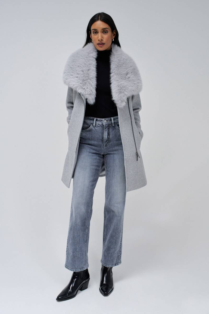 La veste grise avec une robe pull et des bottes